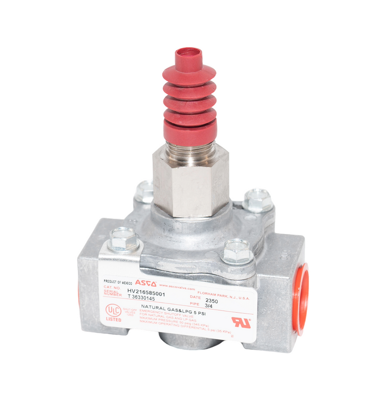 The ASCO HV216585001 gas shut-off valve features a compact 3/4 inch NPT connection with manual cable release, making it ideal for small commercial kitchens, labs, and gas appliance installations. Designed for safety and reliability, it delivers precise emergency shut-off for natural gas and propane lines in regulated environments.